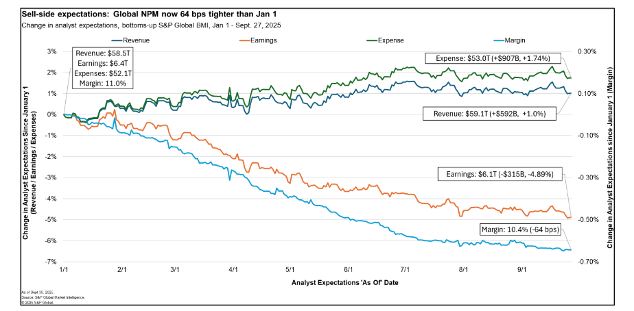 The analysis is sobering: “Revenue expectations have risen — but earnings expectations have fallen — producing a 64-basis-point contraction in margin. If the pattern holds for firms without sell-side coverage, the cost shock would exceed $1.2 trillion in lost profit.”